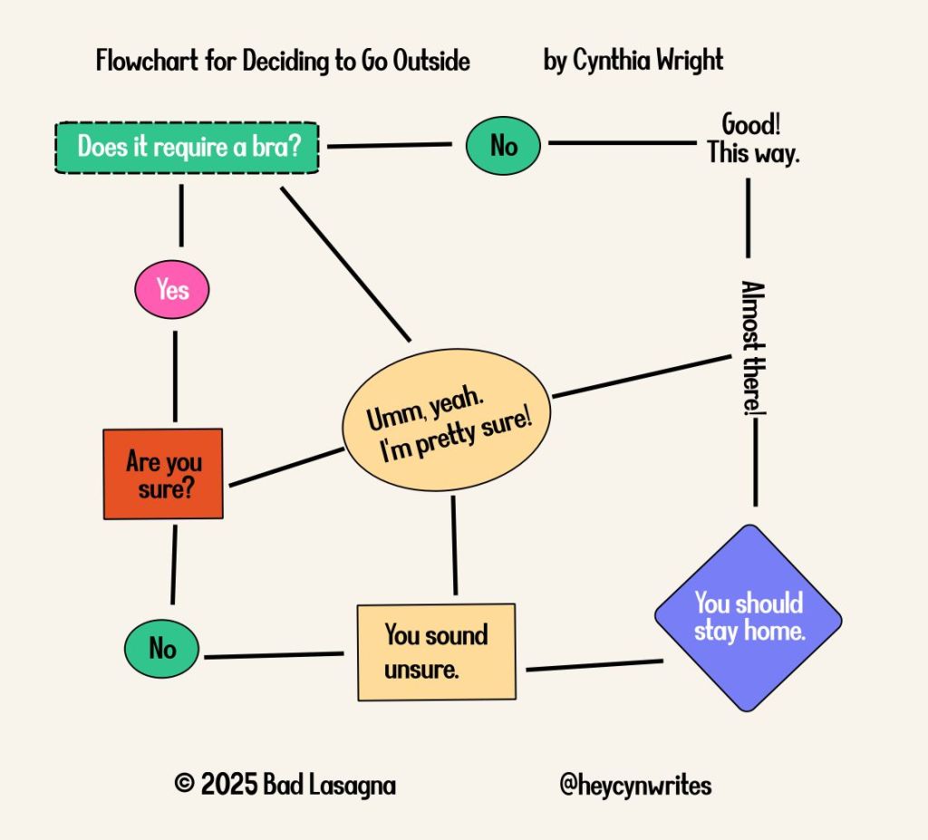 Flowchart for Deciding to Go Outside Cynthia Wright Flowcharts January 9, 2025March 19, 2025 A handy dandy flowchart to help you plan your day. Discover more from Bad Lasagna Webcomic Subscribe to get the latest posts sent to your email. Type your emailโฆ Subscribe Share this post. Email a link to a friend (Opens in new window) Email More Share on Threads (Opens in new window) Threads Share on Bluesky (Opens in new window) Bluesky Share on Mastodon (Opens in new window) Mastodon Share on Reddit (Opens in new window) Reddit Share on Tumblr (Opens in new window) Tumblr Share on Pocket (Opens in new window) Pocket Like Loading... Published January 9, 2025March 19, 2025